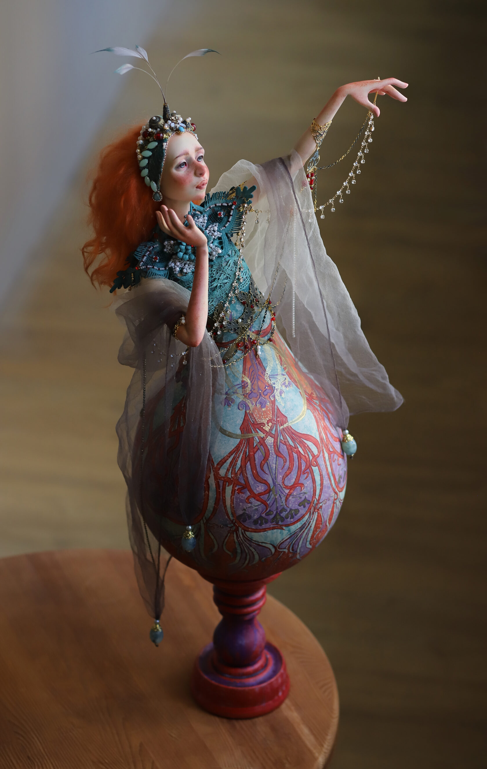 Кукла-лампа представляет собой изысканное необычное украшение интерьера в светлое время суток и совершенно утилитарный светильник в темное время. Кукла снабжена светодиодной подсветкой, что придает мягкое интимное освещение пространству. Кукла-лампа подключается в домашнюю сеть электро- питания.