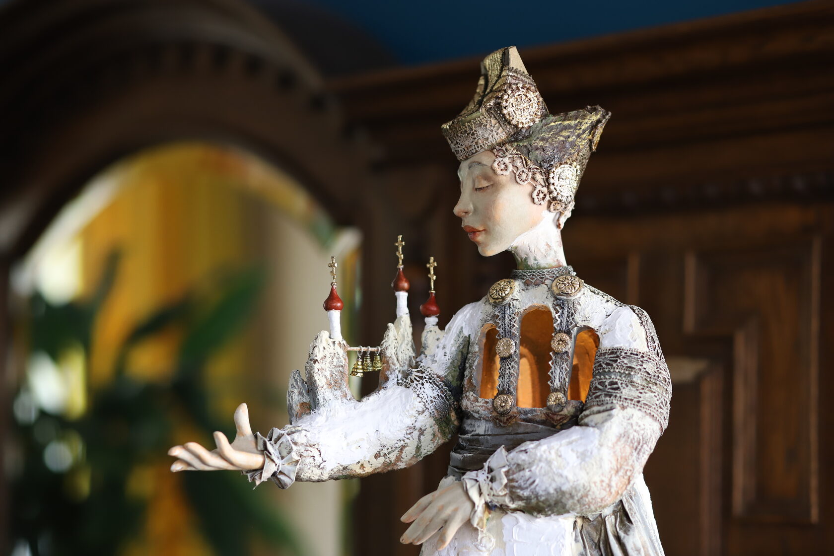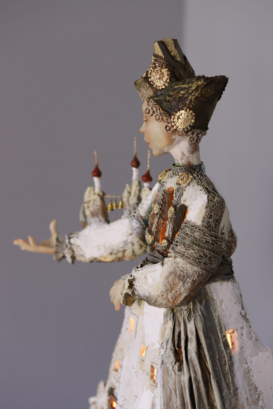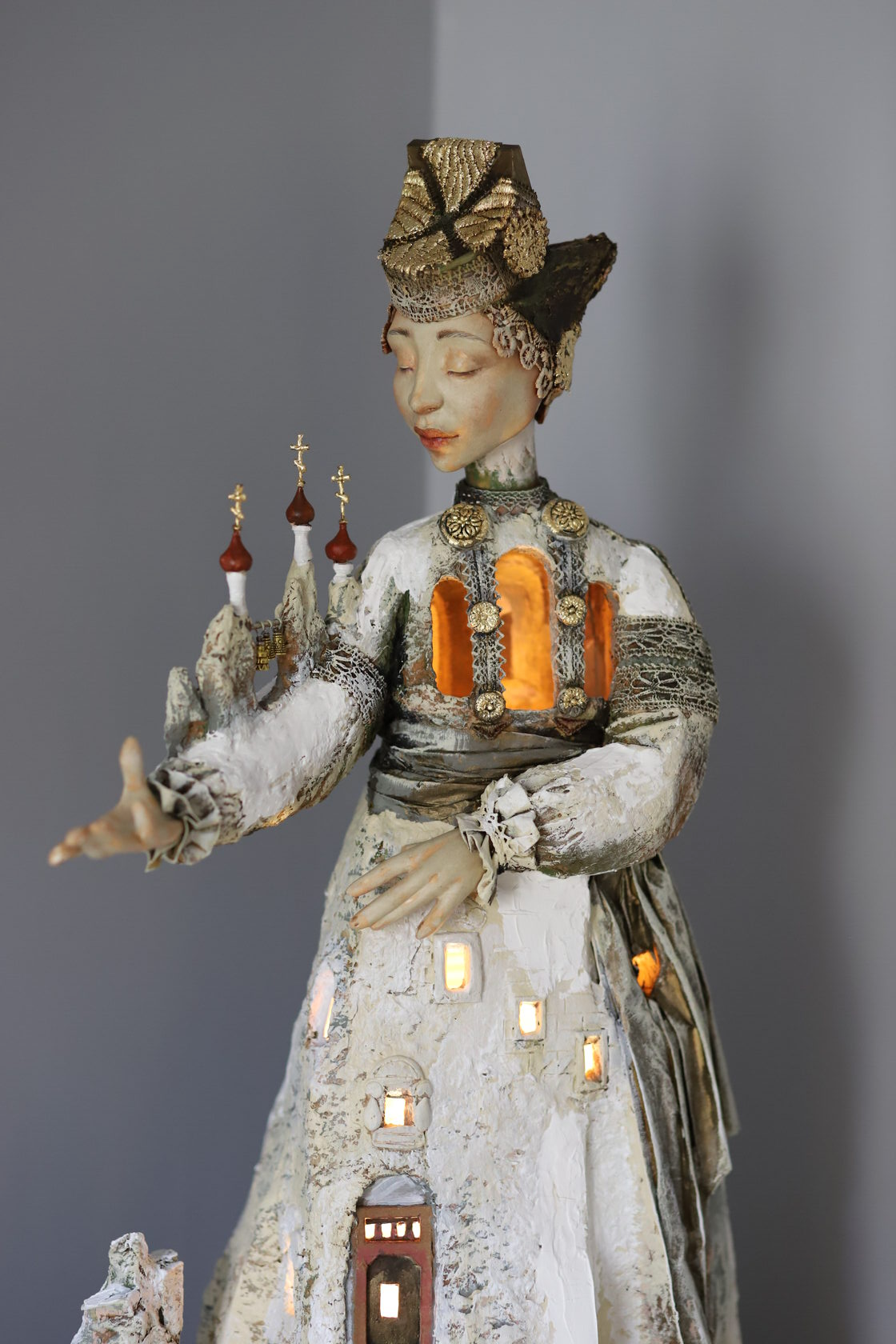 Кукла «Молитва» о непростом сегодняшнем времени для России. Этот образ пронизан символами силы, мощи, богатства, стойкости духа, могущества, широты души, хрупкости и любви. Различные противоположности органично сливаются и подчеркивают идейный замысел куклы. Перед зрителем предстает независимая хрупкая дева с русой косой и в традиционном головном уборе - кокошнике с украшением в виде танковой брони. У куклы завешены кольчугой глаза, она обращена вовнутрь себя, не смотрит на сторонних. Ангелы, сидящие на плечах, символизируют святость и чистоту Руси, они держат в руках атрибуты власти и силы - императорские короны, зажженные фонари и весы как знак справедливости. Фигура лишена привычных нам конечностей, руки ее - это металлическая перчатка, почти оружие. Она правит стальной рукой. И крыло, заменяющее ей щит, которым она защищает своих людей. Стоит она на бескрайних просторах, землях, покрытых луговыми травами и хранящих в себе несметные богатства. Лики святых раскрывают православную культуру России. Человек молится всегда- в радости и в невзгодах, в победах и потерях. Молитва – вечна, просьбы в ней о разном.