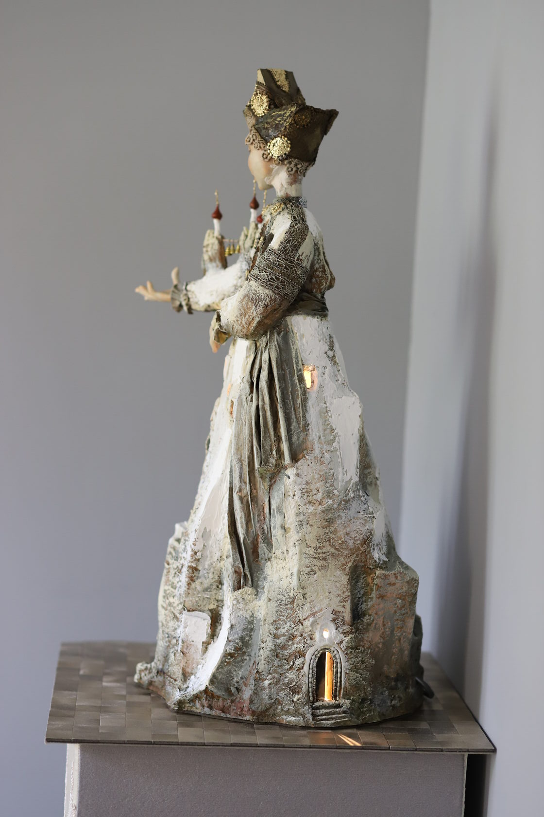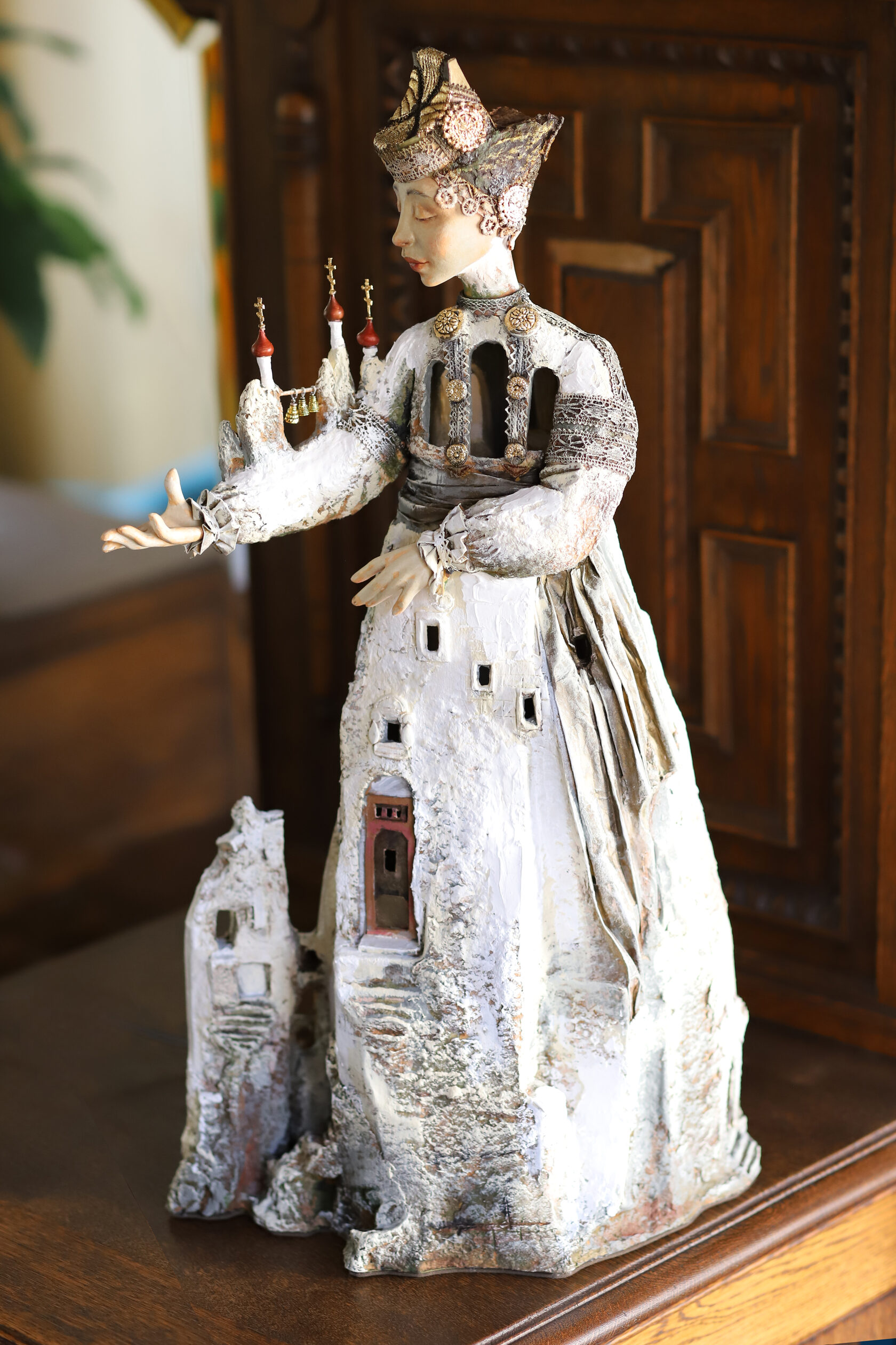 Интерьерная кукла-светильник "Меловой горы хозяйка", объединяет в себе образ женщины в традиционном костюме Воронежской губернии и архитектурные черты горного монастыря, словно вырастающего из меловых склонов. Эта работа представляет собой одновременно декоративный и функциональный объект, источник мягкого, рассеянного света и живую скульптуру, наполненную аллюзиями на богатое культурное наследие региона. Тщательно подобранные сорт и фактура бумаги позволяют передать изящные элементы народного костюма: головной убор, вышитые детали, складки ткани — которые плавно трансформируются в стены, арки и купола, напоминающие о затерянных среди меловых гор монастырях. Каждый фрагмент силуэта становится частью архитектуры, а гладкие и рельефные области создают игру света и тени, раскрывая уникальность меловых гор. Кукла-светильник формирует особый атмосферный акцент в интерьере: сияние изнутри подчеркивает пластичность образа, будто бы наполняя его историей и тихим внутренним светом. Этот объект приглашает к созерцанию, размышлениям о гармонии природы, традиций и архитектуры, возникшей в диалоге с уникальным меловым ландшафтом Воронежской земли.