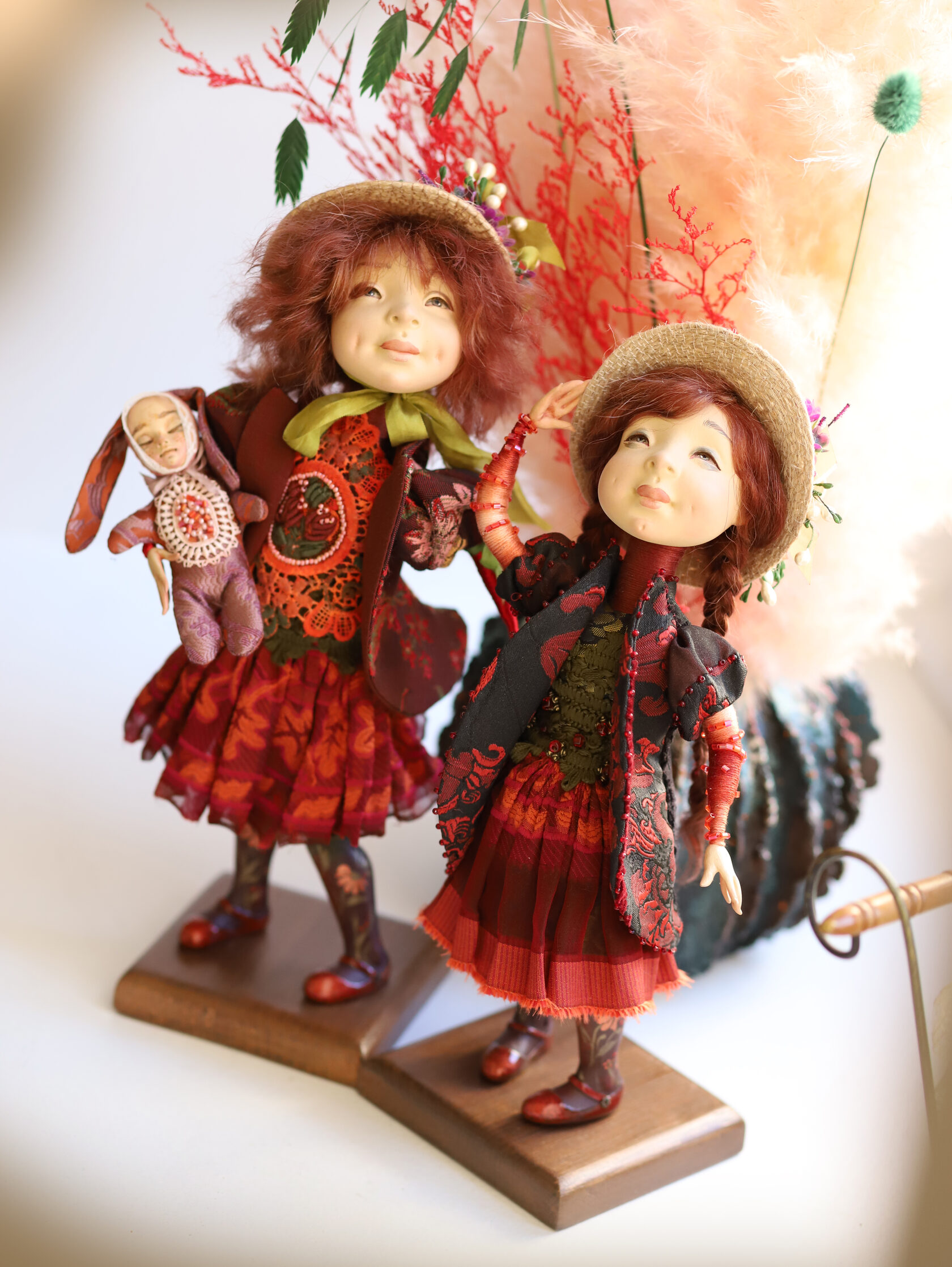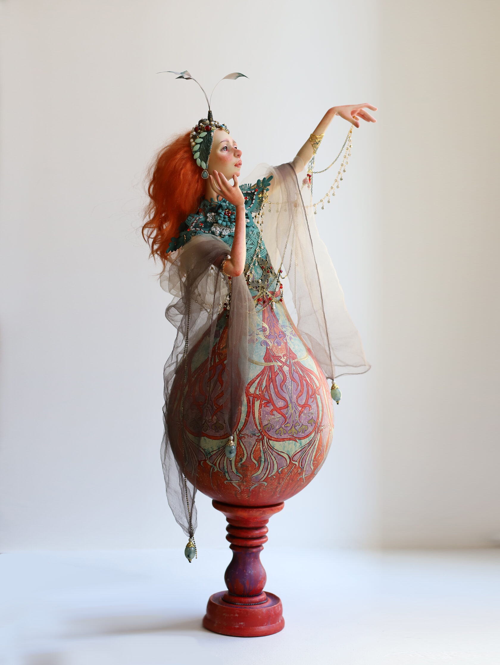 Беспокойство, ирония, кукольная театральность мира, комедия эротизма, пестрота маскарадных уродцев, неверный свет свечей — вдруг мрачные провалы в смерть, колдовство — череп, скрытый в одеждах, автоматичность юродивость поз, мертвенность и жуткость любезных улыбок. Кукла из серии "Колода карт". Созданная в год, когда мы все томились взаперти в пандемию, какой персонаж смог бы лучше передать настроения и ситуацию. В широких отворотах ботфорт скрыт сюрприз, но он только для владельца куклы!